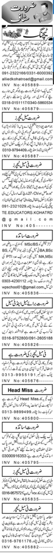 Vacant posts including physics teacher, teacher, montessori teacher, biology teacher, head teacher, pak study teacher, urdu teacher, computer science teacher, english teacher, female teacher, fine arts teacher, chemistry teacher, nazara teacher, islamiat teacher, mathematics teacher, sweeper, preschool teacher, coordinator and head mistress are announced in Private School Peshawar, peshawar Khyber Pakhtunkhwa KPK Pakistan as per 12 March 2022 advertisement in daily Aaj Newspaper. Preferred Education is Master, Bachelor and Intermediate etc.