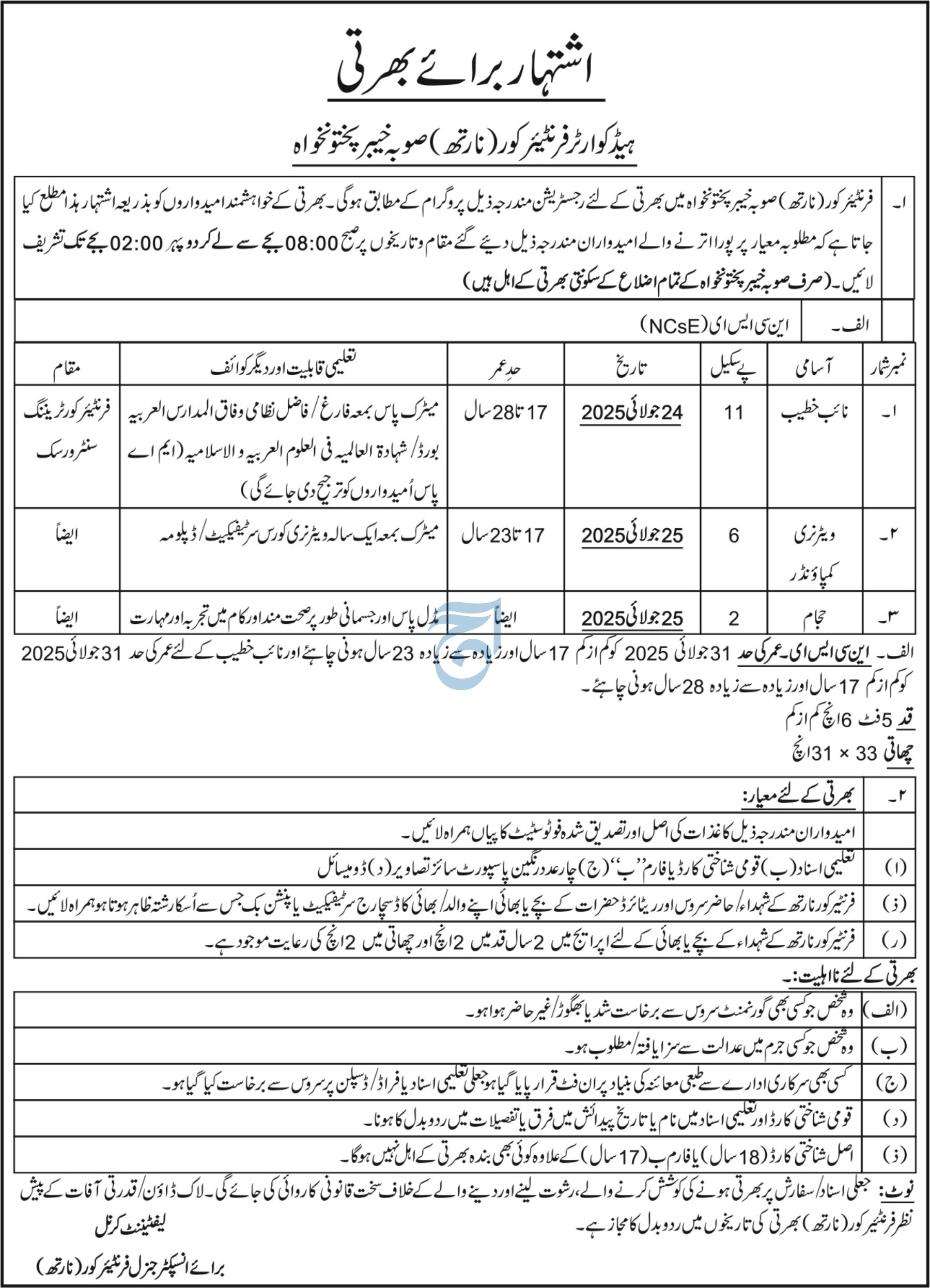 Headquarter Frontier Core jobs advertisement dated about 21 May 2025 in daily Aaj Newspaper invites application for the vacant post of veterinary compounder, hajam and naib khateeb in Peshawar, peshawar Khyber Pakhtunkhwa KPK Pakistan. Primary, Middle and Matric etc. educational qualification will be preferred.