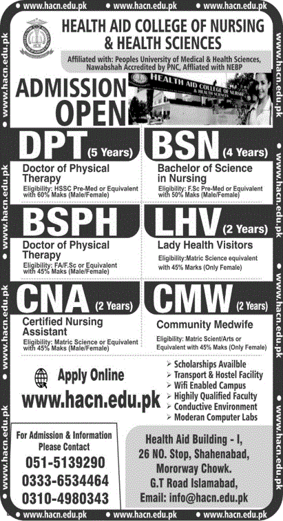 Health Aid College of Nursing & Health Sciences affiliated with Peoples University of Medical & Health Sciences has announced admissions in DPT, BSN, BSPH, LHV, CNA and CMW in Islamabad. Read newspaper ad for exact details.