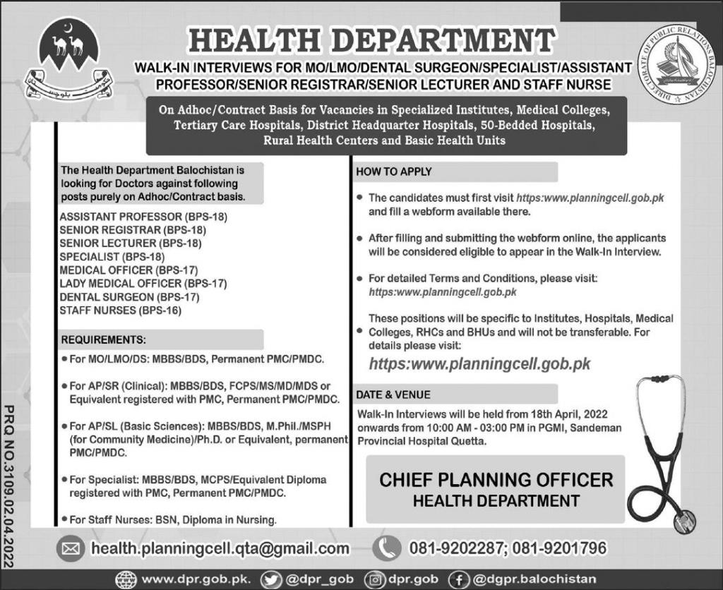 Vacant posts including registrar, assistant professor, dental surgeon, specialist, staff nurse, medical officer and lecturer are announced in Health Department Quetta, quetta Balochistan Pakistan as per 3 April 2022 advertisement in daily Express Newspaper. Candidates with Master, MBBS and Bachelor etc. educational background will be preferred.