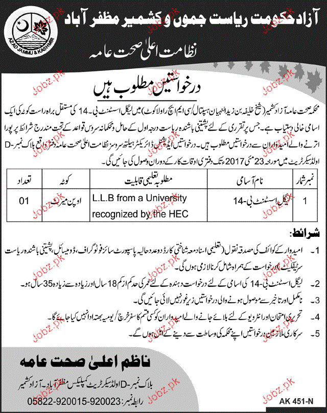 Health Department Govt of AJK Job Open of Legal Assistant