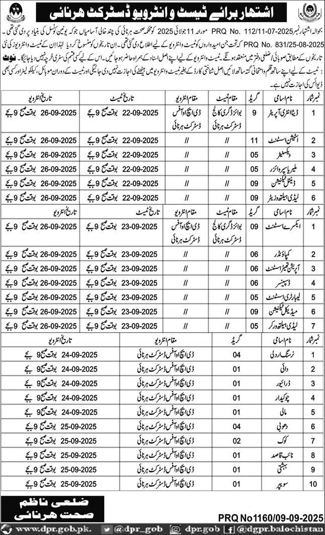 Health Department jobs advertisement dated about 10 September 2025 in daily Express Newspaper invites application for the vacant post of dispenser, lhv, nursing orderly, chowkidar, data entry operator, x ray assistant, naib qasid, dental technician, bashti, sweeper, driver, mali, compounder, dai, lady health visitor, medical technician, station assistant, laboratory assistant, malaria supervisor, vaccinator, dhoobi and cook in Harnai, harnai Balochistan Pakistan. Preferred Education is Middle, Matric, Bachelor, Intermediate and Primary etc.