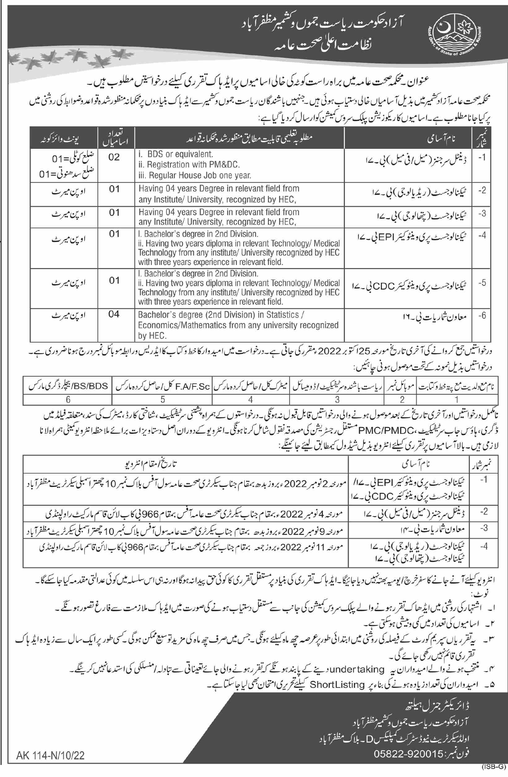 Health Department jobs advertisement dated about 8 October 2022 in daily Dawn Newspaper invites application for the vacant post of technologist pre ventocare, technologist and dental surgeon in Muzaffarabad, muzaffarabad AJK Pakistan. Matric and Intermediate etc. educational qualification will be preferred.