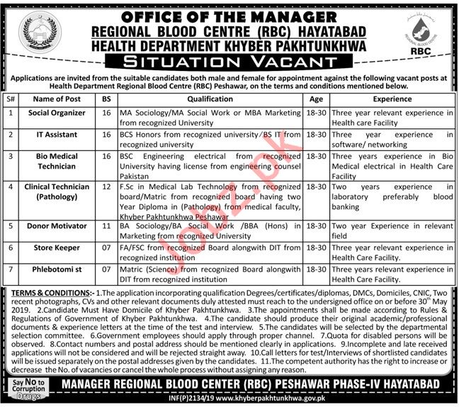 Qualified and well educated individuals for the positions of Social Organizer, IT Assistant, Bio Medical Technician, Clinical Technician Pathology, Donor Motivator, Storekeeper & Phlebotomist required for office of the Manager Regional Blood Centre RBC Hayatabad Health Department Khyber Pakhtunkhwa 2019.