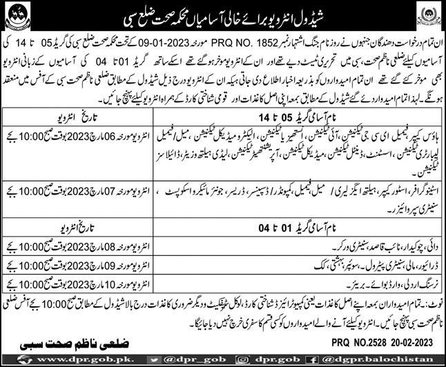 Health Department is looking for candidates for following posts as per job advertisement published in daily Express Newspaper of February 21, 2023 for location Sibi, sibi Balochistan Pakistan: