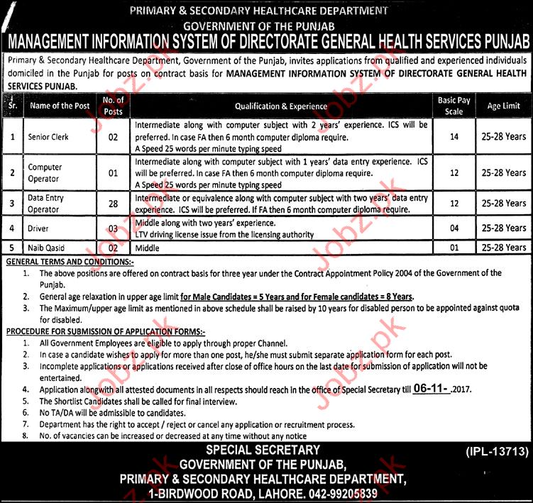Primary & Secondary Healthcare Department, Government of The Punjab is currently looking for highly qualified and experienced persons for the posts of Senior Clerk, Computer Operator, DEO & Driver & Naib Qasid in Lahore, Punjab. The interested persons contact and apply as per given criteria.