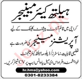 Vacant posts including healthcare manager and operaiont manager are announced in Clinic Karachi, karachi Sindh Pakistan as per 25 September 2022 advertisement in daily Jang Newspaper. Educational qualifications required Bachelor and Master etc.