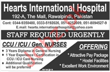 Hearts International Hospital CCU / ICU & Gen. Nurses Jobs