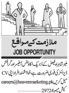 Heaven Marketing Pvt Limited is looking for candidates for following posts as per job advertisement published in daily Jang Newspaper of January 9, 2024 for location Karachi, karachi Sindh Pakistan: