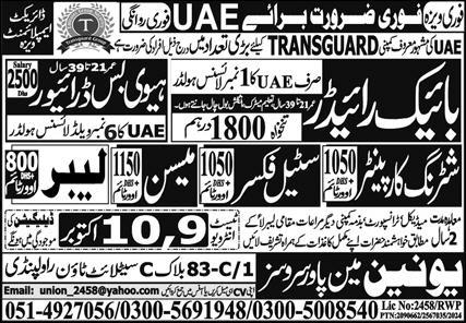 Union Manpower Services is looking for candidates for following posts as per job advertisement published in daily Express Newspaper of October 8, 2024 for location Abu Dhabi, sharjah UAE: