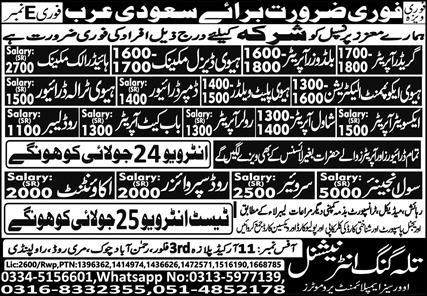 Talagang International Overseas Employement Promoters is looking for candidates for following posts as per job advertisement published in daily Express Newspaper of July 25, 2023 for location Riyadh, jeddah Saudi Arabia: