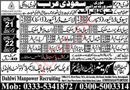 Dahlawi Manpower Recruiting jobs advertisement dated about 19 November 2023 in daily Express Newspaper invites application for the vacant post of light vehicle mechanic, light driver, heavy equipment mechanic, telescopic operator, shovel operator, buildozer opertor, greeder operator, mobile crane operator, side boom operator, heavy vehicle mechanic, heavy driver, bob kat operator, roller operator and becho loader operator in Riyadh, riyadh Saudi Arabia. Persons with Bachelor, Intermediate and Matric etc. education can apply.