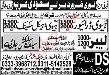 Vacant posts including heavy vehicle mechanic, heavy driver and labor are announced in DS Smart International Riyadh, riyadh Saudi Arabia as per 9 June 2024 advertisement in daily Express Newspaper. Persons with Matric and Middle etc. education can apply.