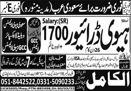 Vacant posts including htv driver, heavy driver and driver are announced in Al Kamil Enterprises Overseas Employment Promoters Madina, madina Saudi Arabia as per 11 April 2022 advertisement in daily Express Newspaper. Educational qualifications required Intermediate and Matric etc.