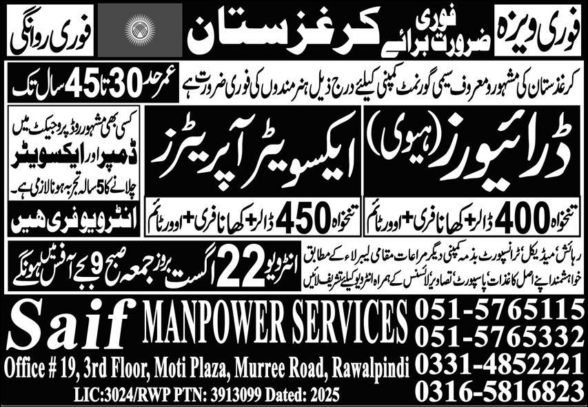 Saif Manpower Services is looking for candidates for following posts as per job advertisement published in daily Express Newspaper of August 21, 2025 for location Bishkek, bishkek Kyrgyzstan: