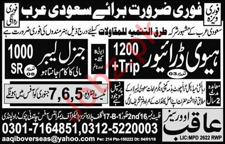 Vacancies in Aaqib Overseas Employment Advertisement January 2019