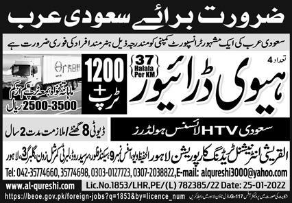 Apply at Al Qureshi International latest Overseas jobs in Driving and departments before closing date which is around February 4, 2022 or as per closing date in newspaper ad. Read complete ad online to know how to apply on latest Al Qureshi International job opportunities. Salary varies from 120000. Earn extra money with overtime. On job accommodation, medical and transport facility is provided.