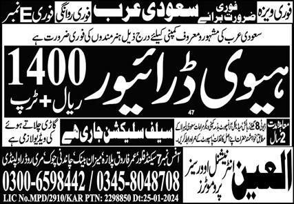 Al Ain International Overseas Employment Promoter is looking for candidates for following posts as per job advertisement published in daily Express Newspaper of February 20, 2024 for location Dammam, jeddah Saudi Arabia: