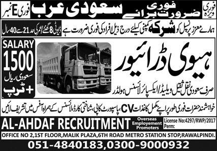 Al Ahdaf Recruitment Overseas Employment Promoters latest Overseas Driving jobs and others can be applied till March 26, 2024 or as per closing date in newspaper ad. Read complete ad online to know how to apply on latest Al Ahdaf Recruitment Overseas Employment Promoters job opportunities. Learn today skills like English (UK) and Driving to apply confidently on these Al Ahdaf Recruitment Overseas Employment Promoters jobs. Salary varies from 115000. Extra hours work allowed to earn more. Employer provides accommodation, medical and transport facility.
