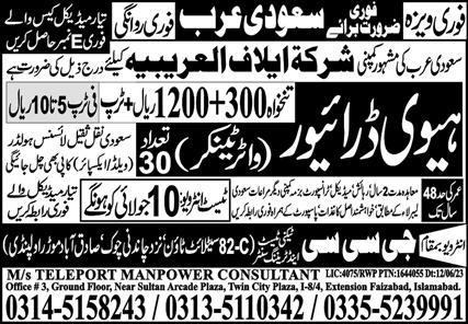 Teleport Manpower Consultants jobs advertisement dated about 8 July 2023 in daily Express Newspaper invites application for the vacant post of water tanker driver and heavy driver in Saudi Arabia, saudi arabia Saudi Arabia. Candidates with Intermediate, Primary, Matric and Middle etc. educational background will be preferred.