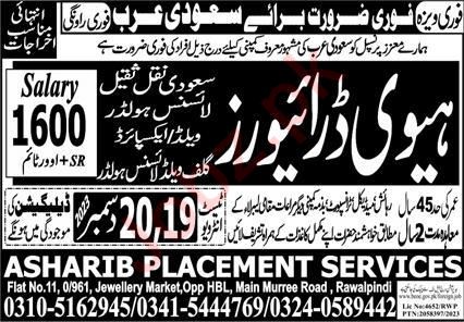Asharib Placement Services Riyadh, riyadh Saudi Arabia invites applications from eligible candidates for the post of heavy driver as per advertisement of December 17, 2023 published in daily Express Newspaper. Persons with Matric and Middle etc. education can apply.