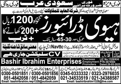 Latest Driving jobs and others Overseas jobs in Bashir Ibrahim Enterprises OEP closing date is around June 29, 2025, see exact from ad. Read complete ad online to know how to apply on latest Bashir Ibrahim Enterprises OEP job opportunities.