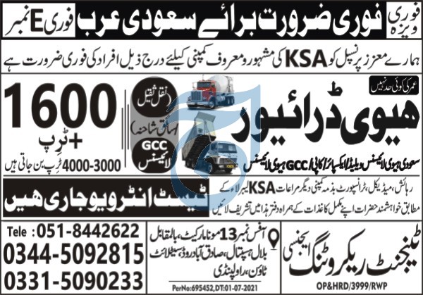 Apply at Tangent Recruitment Agency Overseas Employment Promoters latest Overseas jobs in Driving and departments before closing date which is around March 25, 2022 or as per closing date in newspaper ad. Read complete ad online to know how to apply on latest Tangent Recruitment Agency Overseas Employment Promoters job opportunities. Facilities like accommodation, medical and transport may be provided.
