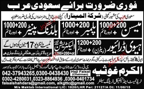 Heavy Drivers, Mason, Plumbers Job Opportunity