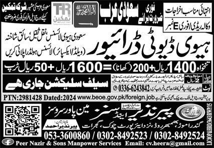 Peer Nazeer & Sons Manpower Services Jeddah, taif Saudi Arabia invites applications from eligible candidates for the post of driver, heavy duty driver and htv driver as per advertisement of October 18, 2024 published in daily Express Newspaper. Persons with Intermediate and Matric etc. education can apply.