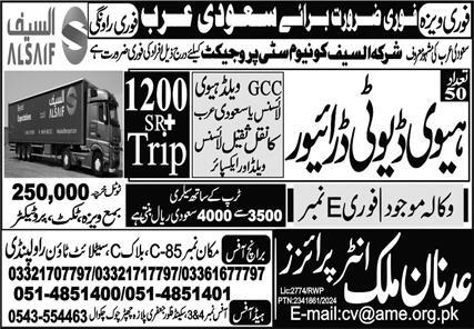 Vacant posts including heavy duty driver are announced in Adnan Malik Enterprises Riyadh, riyadh Saudi Arabia as per 2 March 2024 advertisement in daily Express Newspaper. Educational qualifications required Middle etc.