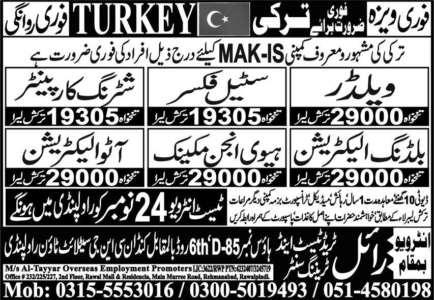 Royal Trade Test & Training Center invites applications for job positions advertised in daily Express dated 22 November 2025 for following vacancies in Istanbul, ankara Turkey.