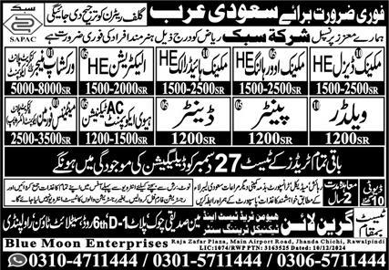 Green Line Human Trade Test & Technical Training Center Dammam, al khobar Saudi Arabia invites applications from eligible candidates for the post of maintenance foreman, denter, mechanic diesel, workshop manager, mechanic overhauling, mechanic diesel he, electrician, painter, heavy equipment ac technician, mechanic overhauling he, welder, mechanic hydraulic, mechanic hydraulic he and electrician he as per advertisement of December 24, 2024 published in daily Express Newspaper. Candidates with Matric, Bachelor, B.E, Intermediate and DAE etc. educational background will be preferred.