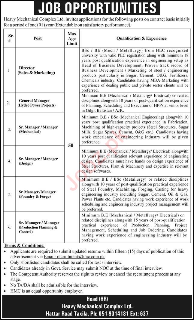 Heavy Mechanical Complex HMC Taxila, taxila Punjab Pakistan invites applications from eligible candidates for the post of manager mechanical, manager foundry forge, manager production planning control, general manager, director and manager design as per advertisement of June 25, 2023 published in daily Jang Newspaper. Candidates with Master, B.E and Bachelor etc. educational background will be preferred.