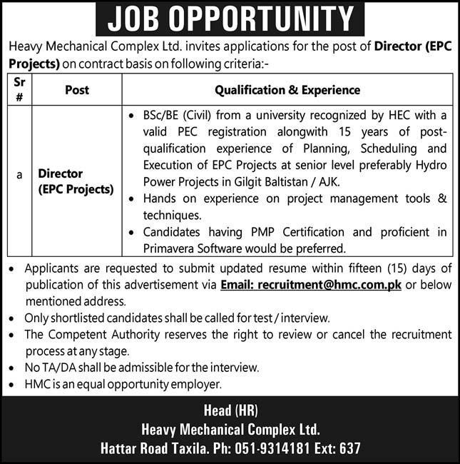 Heavy Mechanical Complex HMC invites applications for job positions advertised in daily Express dated 11 October 2023 for following vacancies in Taxila, taxila Punjab Pakistan.