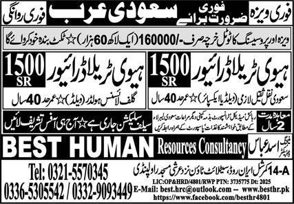 Vacant posts including heavy traila driver, driver and htv driver are announced in Best Human Resources Consultancy Riyadh, dammam Saudi Arabia as per 27 June 2025 advertisement in daily Express Newspaper. Candidates with Intermediate and Matric etc. educational background will be preferred.