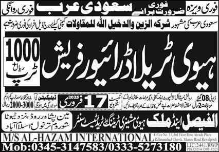 Latest Overseas jobs in Al Hazam International in Driving and others can be applied till 17 February 2025 or as per closing date in newspaper ad. Read complete ad online to know how to apply on latest Al Hazam International job opportunities. Salary varies from 74000. Earn extra money with overtime. Facilities like transport, medical and accommodation may be provided.