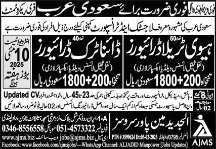 Al Jadeed Man Power Service Jeddah, jeddah Saudi Arabia invites applications from eligible candidates for the post of heavy traila driver and dyna truck driver as per advertisement of May 4, 2025 published in daily Express Newspaper. Candidates with Middle and Matric etc. educational background will be preferred.