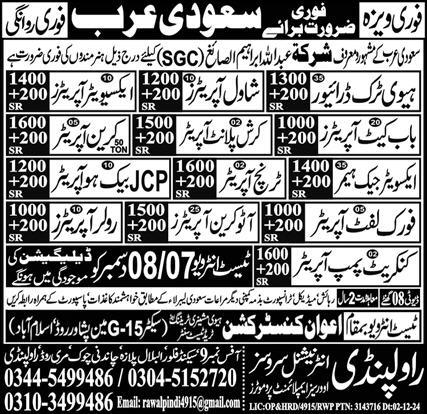 Rawalpindi International Services Overseas Employment Promoters jobs advertisement dated about 4 December 2024 in daily Express Newspaper invites application for the vacant post of excavator operator, shovel operator, trench operator, crane operator, fork lift operator, excavator jack hammer, auto crane operator, roller operator, crush plant operator, jcp becho operator, heavy truck driver, concrete pump operator and bob kat operator in Riyadh, riyadh Saudi Arabia. Educational qualifications required Matric, Middle and Intermediate etc.