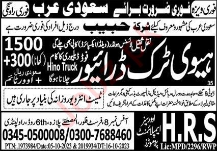Vacant posts including heavy truck driver and htv driver are announced in HRS Overseas Employment Services Makkah, makkah Saudi Arabia as per 22 October 2023 advertisement in daily Express Newspaper. Educational qualifications required Matric etc.