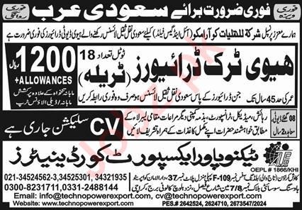 Vacant posts including heavy truck driver are announced in Techno Power Expert Coordinators Company Riyadh, riyadh Saudi Arabia as per 7 July 2024 advertisement in daily Express Newspaper. Middle etc. educational qualification will be preferred.