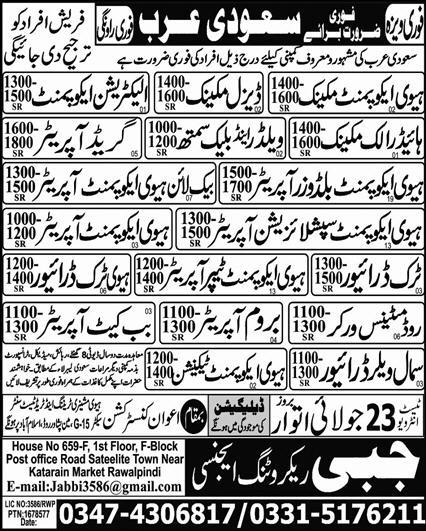 Jabbi Recruiting Agency invites applications for job positions advertised in daily Express dated 21 July 2023 for following vacancies in Dammam, jeddah Saudi Arabia.