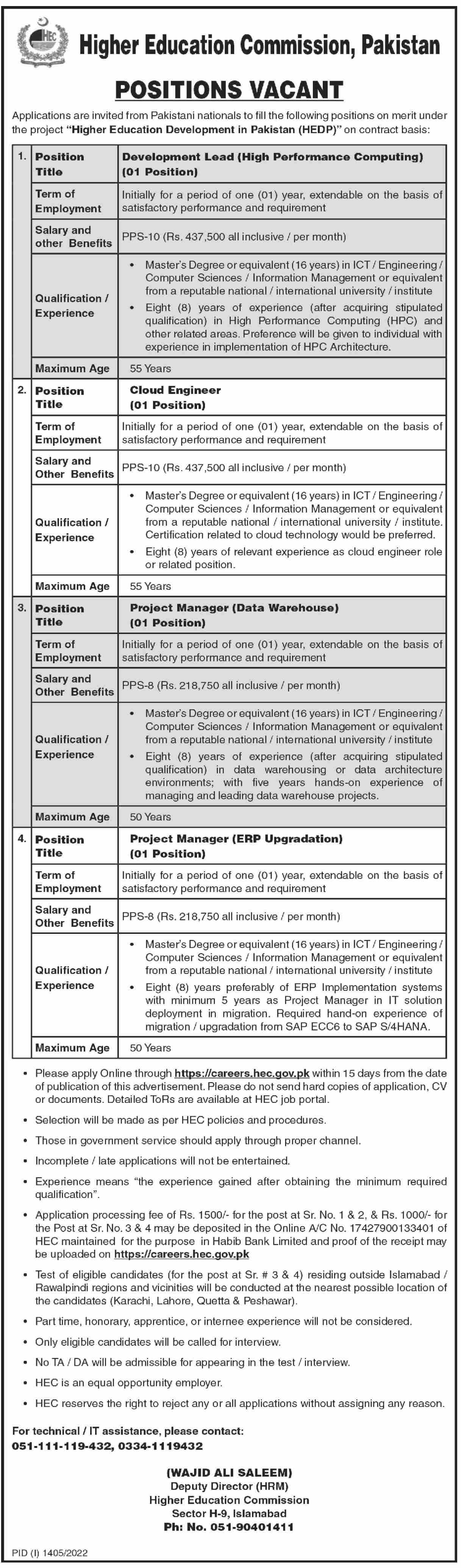 HEC Islamabad Jobs 2022 for Cloud Engineer & Project Manager