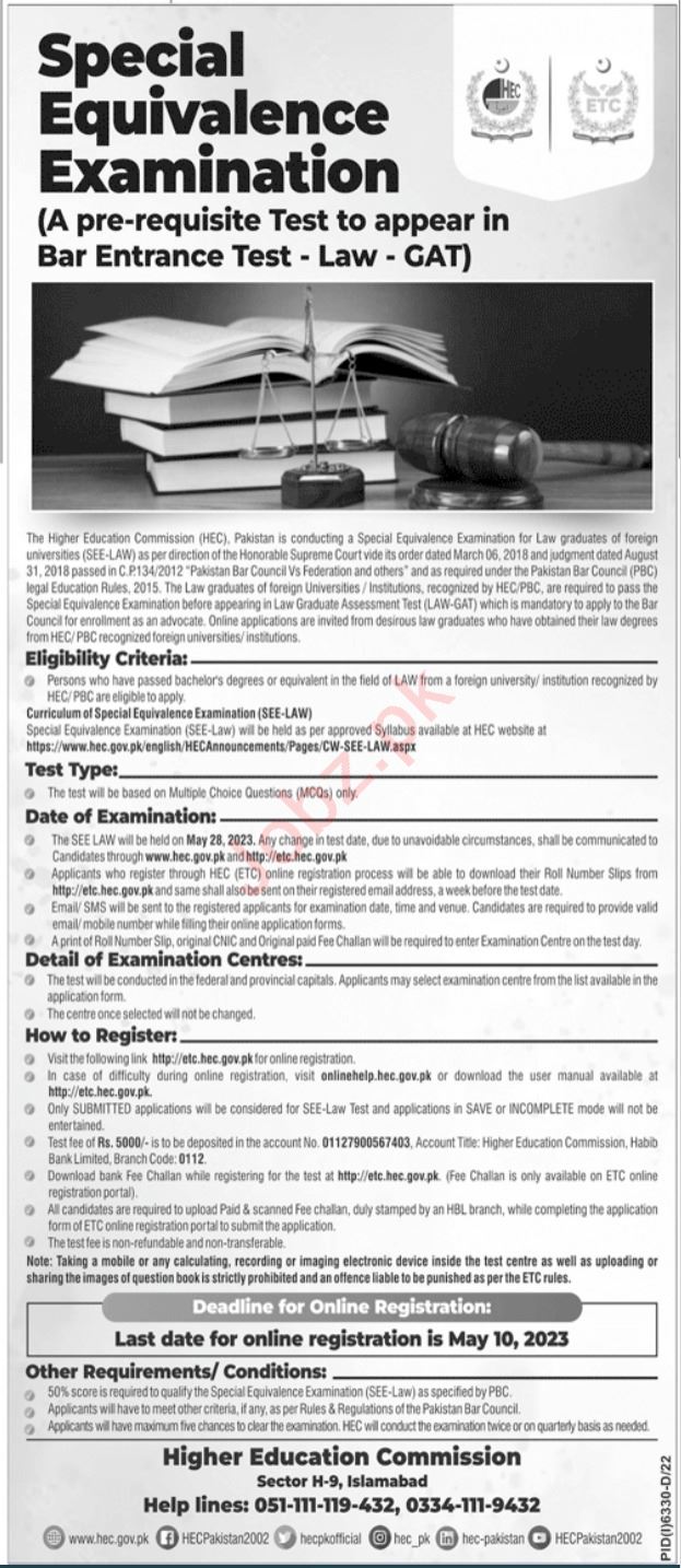 Higher Education Commission HEC jobs advertisement dated about 16 April 2023 in daily Jang Newspaper invites application for the vacant post of hec special equivalence test, hec and hec examination in Islamabad, islamabad Islamabad Pakistan. Persons with LLb and LLM etc. education can apply.
