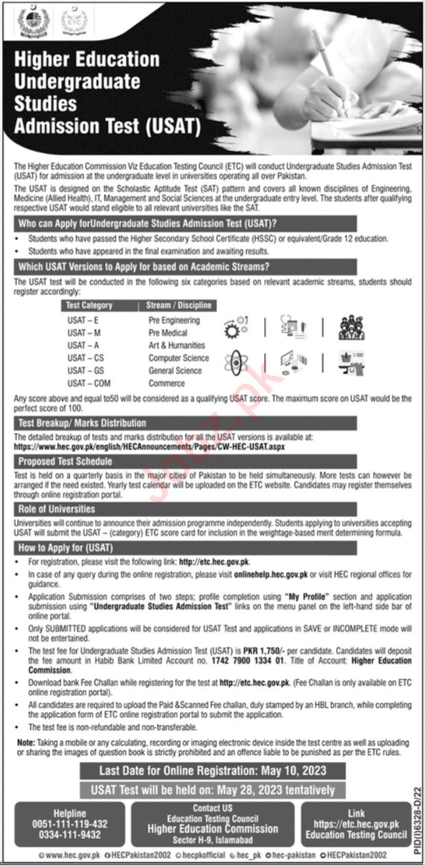 Higher Education Commission HEC jobs advertisement dated about 16 April 2023 in daily Jang Newspaper invites application for the vacant post of usat in Islamabad, islamabad Islamabad Pakistan. Intermediate etc. educational qualification will be preferred.