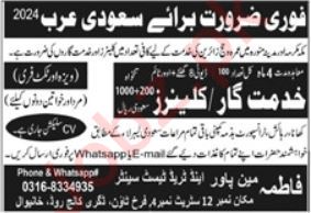 Fatima Manpower Makkah, makkah and madina Saudi Arabia invites applications from eligible candidates for the post of helper, khidmatgar and cleaner as per advertisement of March 24, 2024 published in daily Khabrain Newspaper. Persons with Matric and Middle etc. education can apply.