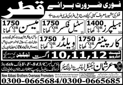 New Abbasi Brothers Oversea Employment Promoters jobs advertisement dated about 9 August 2023 in daily Express Newspaper invites application for the vacant post of helper, steel fixer, carpenter, mason and welder in Qatar, qatar Qatar. Preferred Education is Middle etc.