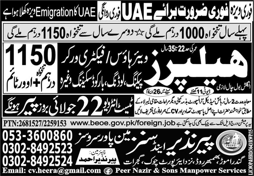 Peer Nazeer & Sons Manpower Services Sharjah, abu dhabi UAE invites applications from eligible candidates for the post of factory worker, warehouse helper and helper as per advertisement of July 20, 2024 published in daily Express Newspaper. Candidates with Matric and Middle etc. educational background will be preferred.