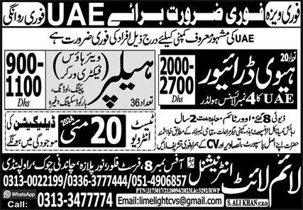LIME LIGHT INTERNATIONAL invites applications for job positions advertised in daily Express dated 18 May 2024 for following vacancies in Sharjah, abu dhabi UAE.
