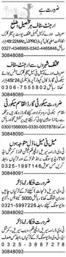 Private Company jobs advertisement dated about 8 April 2023 in daily Express Newspaper invites application for the vacant post of security guard, clerk, call operator, office boy, actor, accountant, model, manager and helper in Lahore, lahore Punjab Pakistan. Candidates with Matric, Intermediate, Bachelor and Middle etc. educational background will be preferred.