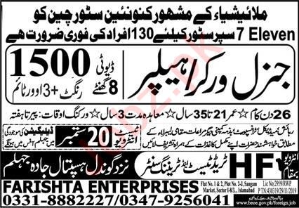 Vacant posts including general worker and helper are announced in Farishta Enterprises Oversea Employment Promoters Malaysia, malaysia Malaysia as per 18 September 2022 advertisement in daily Express Newspaper. Persons with Primary, Matric and Middle etc. education can apply.